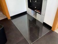 Ein besonderes Detail war eine begehbare Glasplatte um den bestehenden Ofen, die flächenbündig in den neuen Bodenbelag integriert wurde. Hierfür erfolgten präzise Ausfräsungs- und Tieferlegungsarbeiten des Vinylbelags, um eine durchgehende, barrierefreie Fläche zu erzielen und gleichzeitig die brandschutztechnischen Anforderungen zu erfüllen.