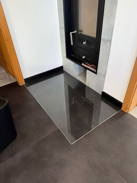 - Einarbeitung einer begehbaren, flächenbündigen Glasplatte vor dem Ofen entsprechend der brandschutztechnischen Erfordernisse: Rüttger Raumausstattungs GmbH
