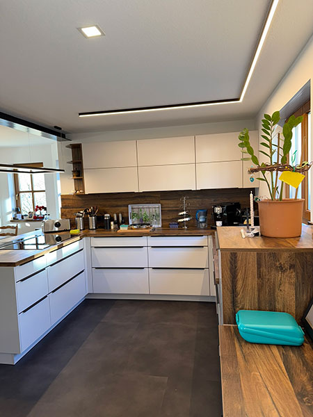 Bei der Modernisierung der Küche in Leinach lag der Fokus auf einer präzisen Planung und reibungslosen Koordination aller Gewerke durch Steffen Kirchner – vom Rohbau über Elektrik und Sanitär bis hin zu Trockenbau, Maler- und Bodenarbeiten. Vom ersten Entwurf bis zur finalen Gestaltung wurde jeder Arbeitsschritt sorgfältig abgestimmt.