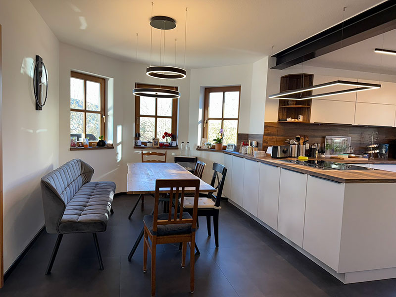 In einem Einfamilienhaus in Leinach wurde die bestehende Küche umfassend modernisiert. Aus drei separaten Räumen – Esszimmer, Küche und Speisekammer – wurde gemütlicher Lebensraum geschaffen. Das Ziel war, den zuvor geschlossenen und funktional in die Jahre gekommenen Bereich in einen modernen, offenen und hellen Wohnküchenbereich zu verwandeln. Der Umbau erfolgte in enger Abstimmung mit den Bauherren und umfasste umfangreiche Planungs-, Umbau- und Modernisierungsarbeiten.